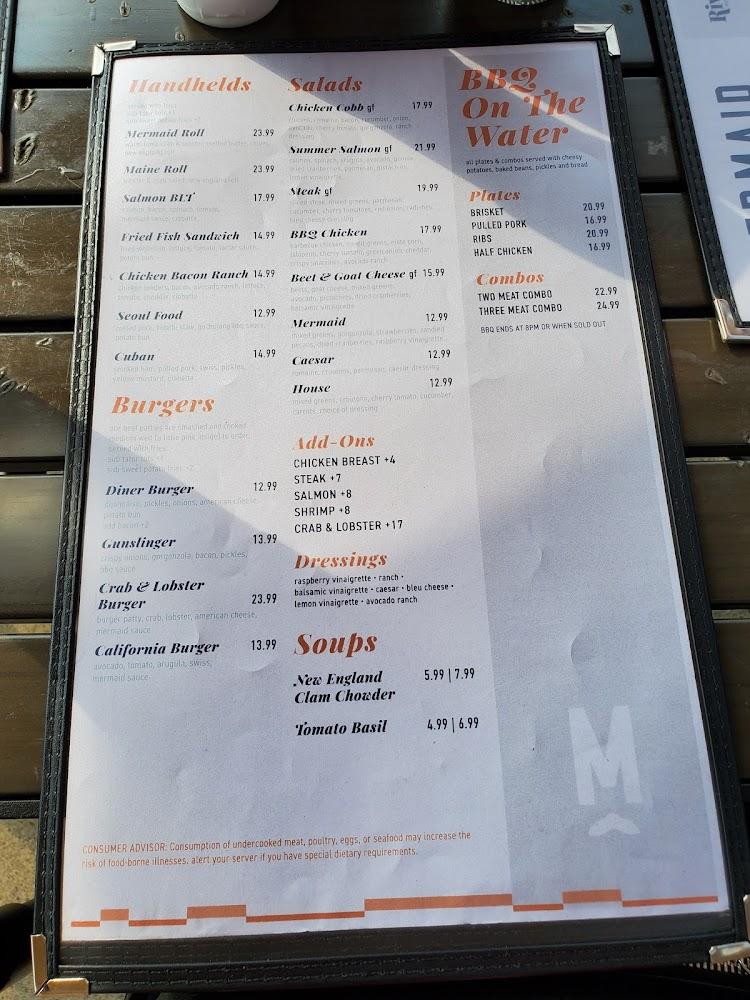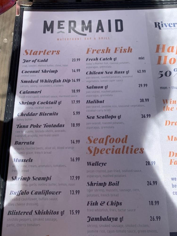 The menu at Mermaid Bar & Grill features a delightful mix of seafood and comfort dishes. Breakfast options include unique choices like Mermaid Breakfast and a Lox Platter. Lunch and dinner highlight fresh fish, including the catch of the day. Seafood lovers will appreciate options like crab and halibut.